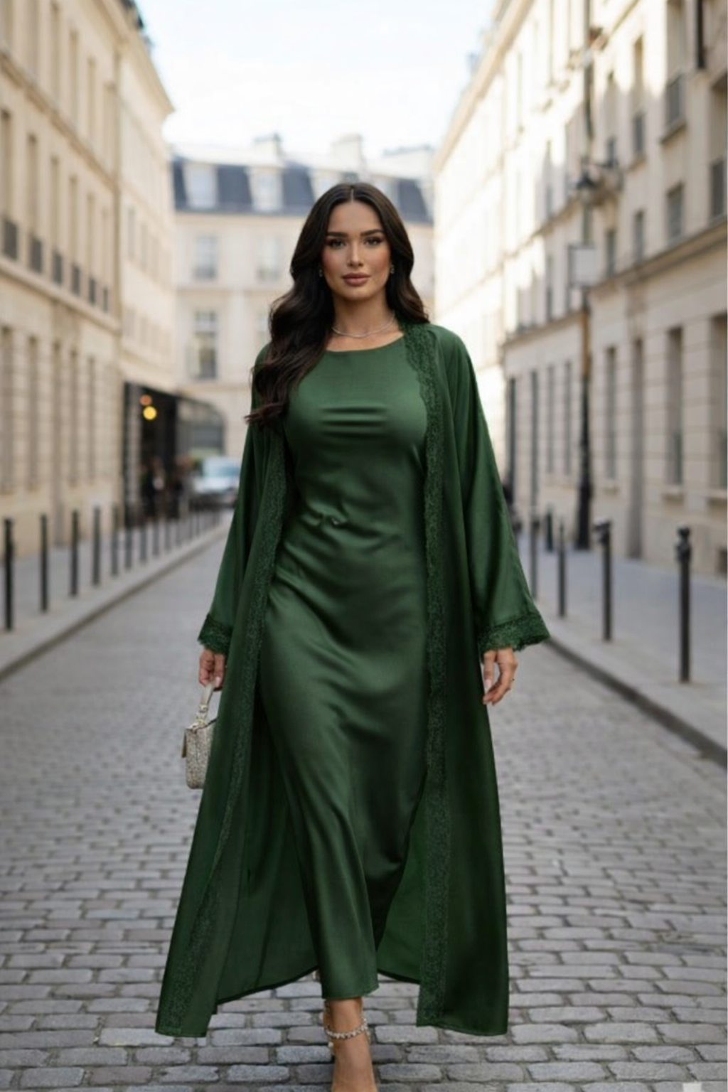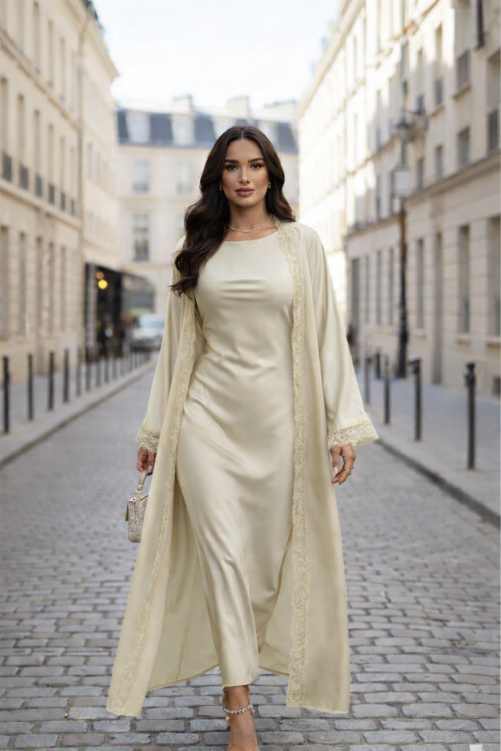 De lange jurk vormt een slank silhouet en valt soepel langs het lichaam, terwijl de kimono met kanten afwerking lichtjes meebeweegt bij iedere stap. Hierdoor ontstaat een gracieuze uitstraling zonder dat de outfit zwaar oogt. Het ontwerp biedt comfort én klasse, waardoor het geschikt is voor zowel formele als semi-formele gelegenheden.