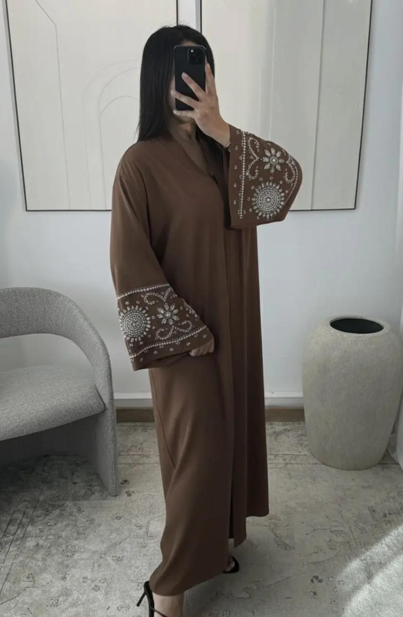 Lichte en ingewikkelde open abaya, gestructureerd met ingewikkelde borduursels aan de voorzijde voor een elegante en gestructureerde uitstraling. De soepelvallende stof en comfortabele pasvorm maken deze abaya ideaal voor zowel een chique als een alledaagse look.
