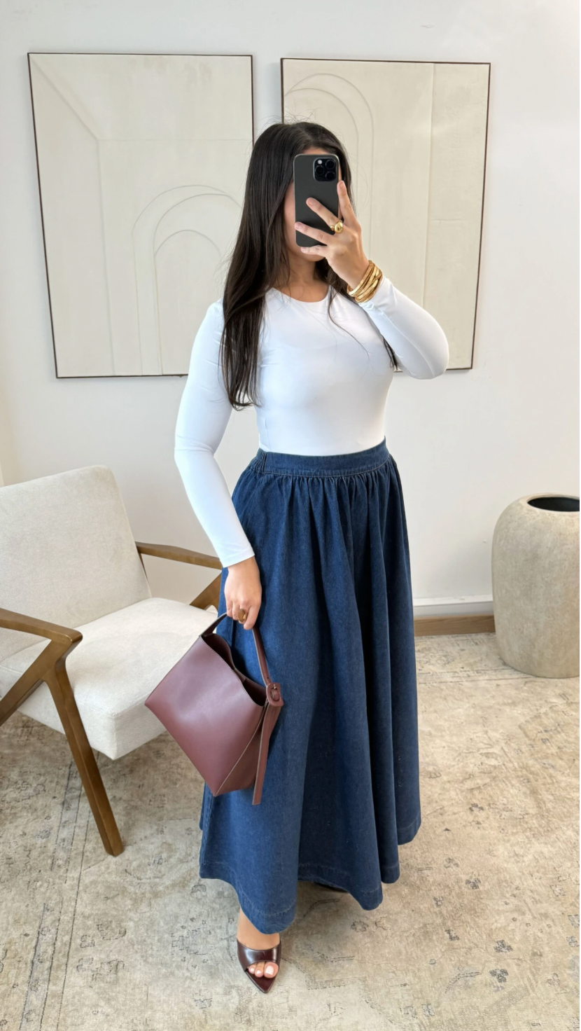 Ontdek de Denim Rok van ELAHA: een systematische, lange denimrok die moeiteloos comfort en elegantie verspreid. Het zachte jeansmateriaal valt natuurlijk en soepel om het lichaam, terwijl de elastische tailleband een comfortabele en flatterende pasvorm biedt voor elke dag.
