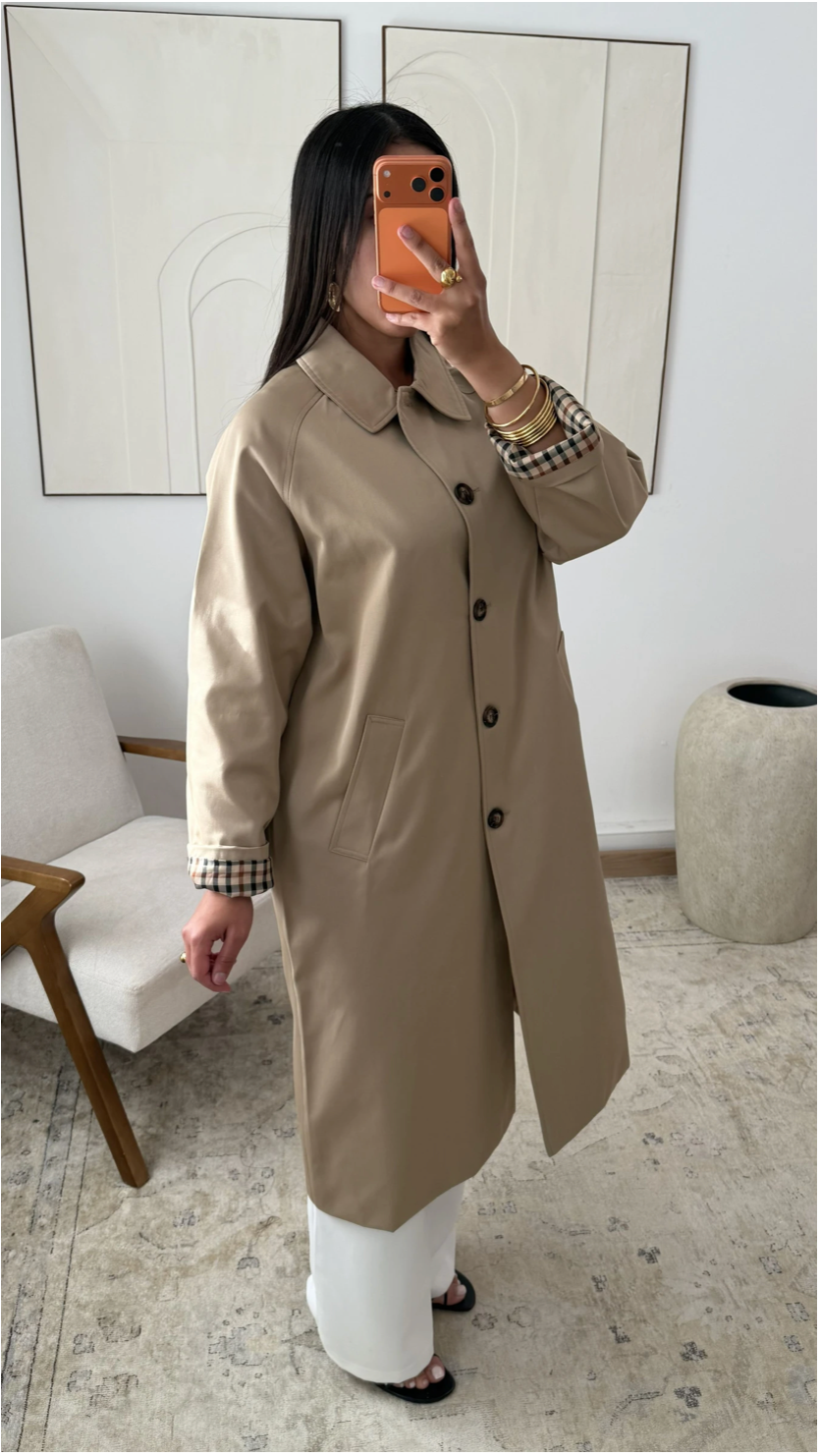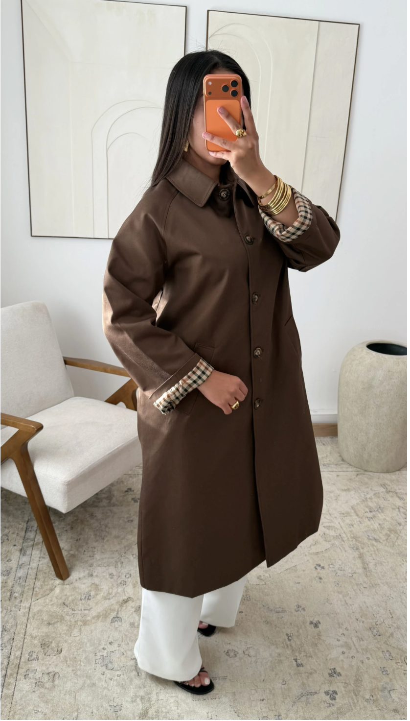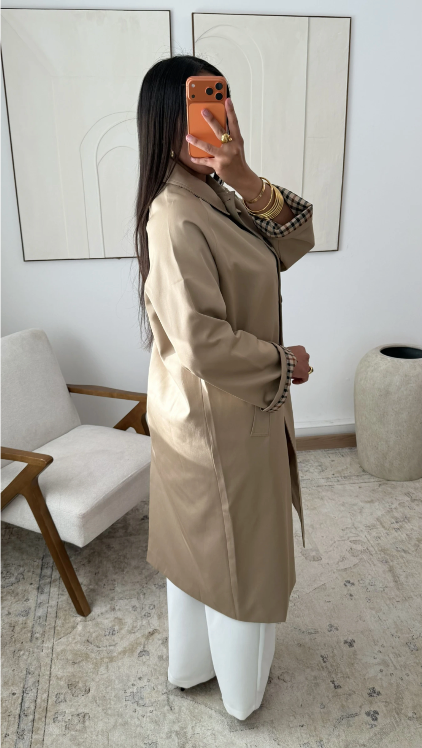 De jas is afgewerkt met een klassieke kraag, indirecte knoopsluiting en lichte schouders die zorgen voor een nette en verzorgde look. De mouwen zijn voorzien van een elegante omslag met een contrasterende voering, wat een luxe detail toevoegt. Perfect om over een abaya, jurk of twinset te dragen — zowel dagelijks als bij een formele gelegenheid.