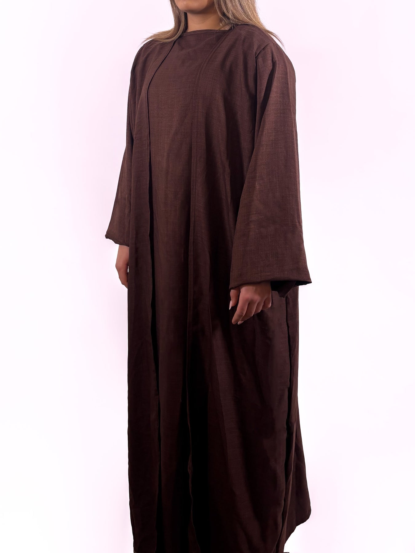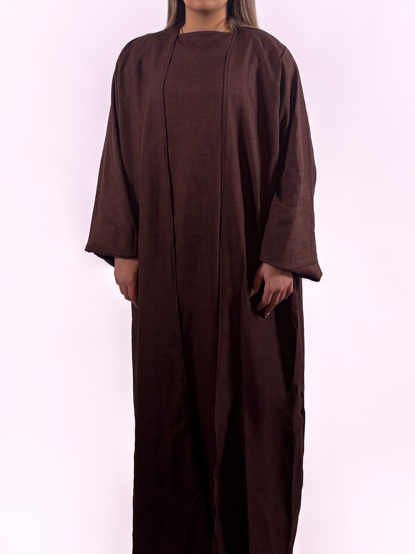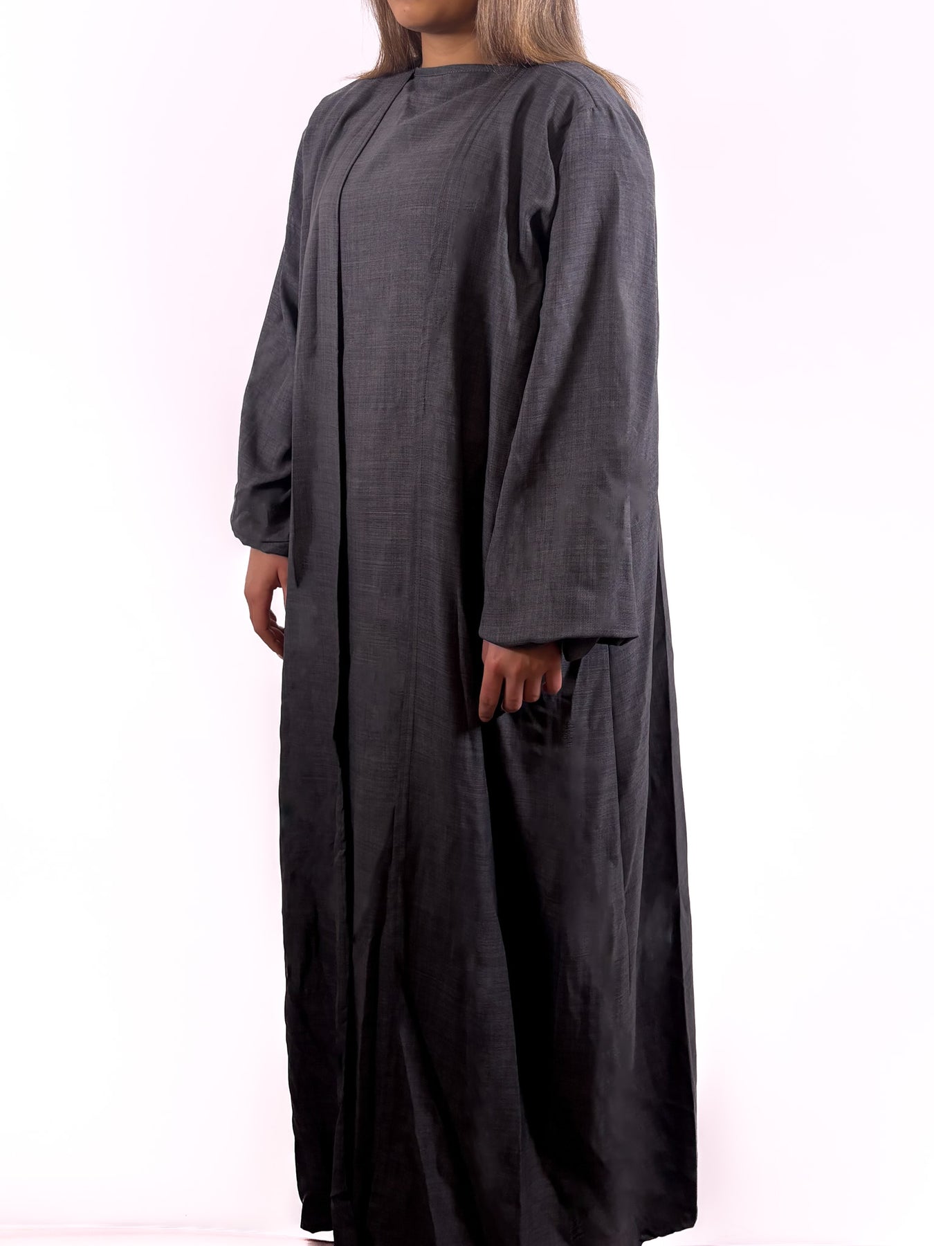 Deze kimono set verspreide comfort met een stijlvolle, discrete uitstraling. De set bestaat uit een mouwloze abaya met een standaard open kimono, waardoor een gelaagde en elegante look ontstaat. Het ontwerp is bewust eenvoudig gehouden, zodat de focus op de systematische lijnen en de rustige uitstraling van het geheel ligt.
